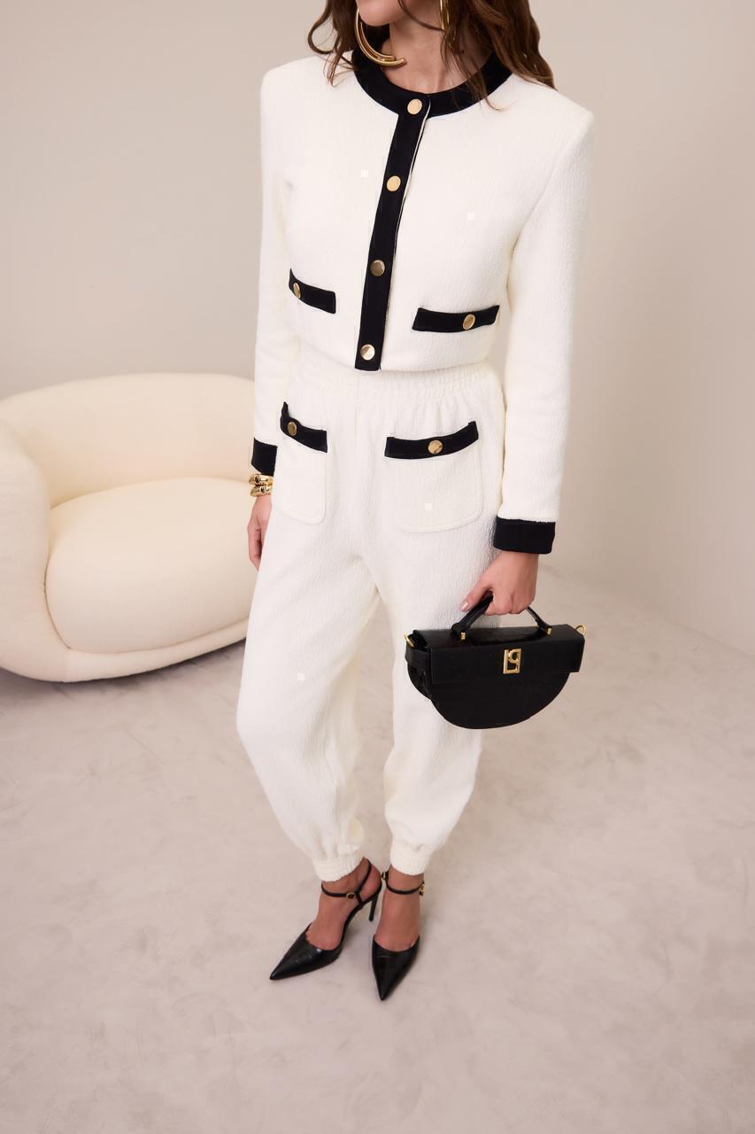 O casaco curto traz design moderno e elegante, com corte ajustado que valoriza a silhueta e reforça o estilo sofisticado da marca. Já a calça jogging, com cintura alta e acabamento refinado, garante conforto e mobilidade sem abrir mão do charme.