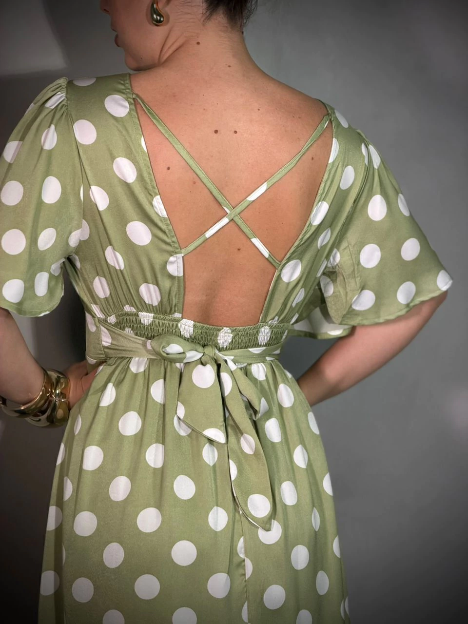 Com decote transpassado e mangas amplas, o vestido valoriza o colo e confere leveza à silhueta. Nas costas, o decote profundo com tiras cruzadas e o laço ajustável adicionam um toque de sensualidade sofisticada. O babado na barra finaliza a peça com fluidez e romantismo.