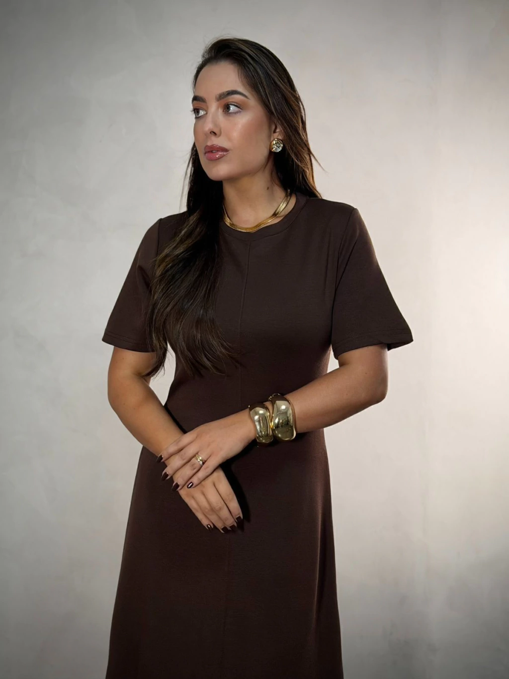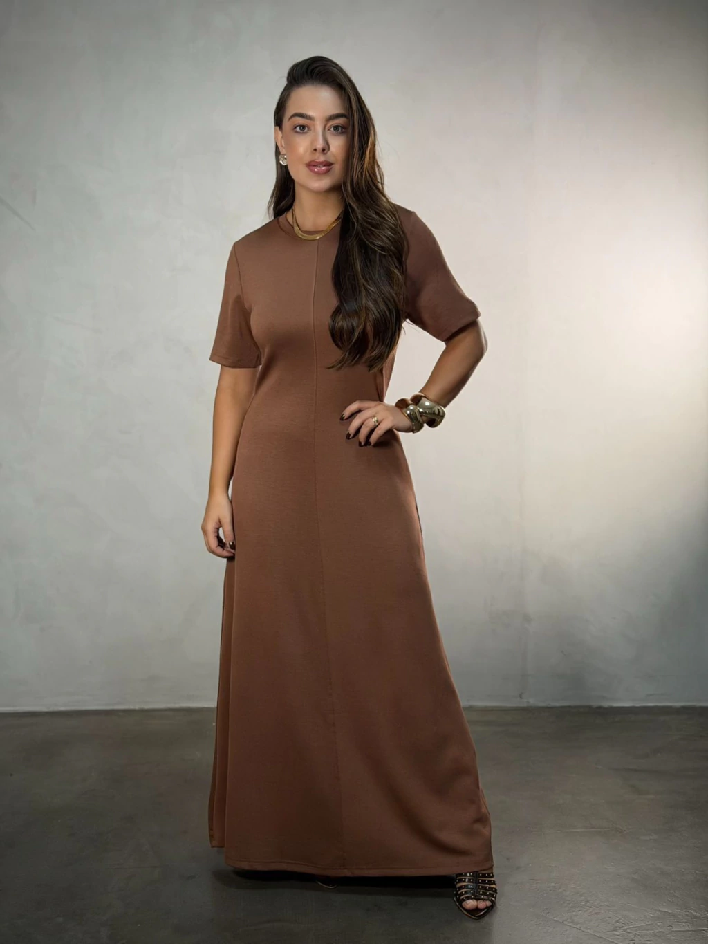 Com modelagem longa e clean, o vestido alonga a silhueta com naturalidade. As mangas curtas equilibram o visual, trazendo leveza e versatilidade. Uma peça atemporal, perfeita para produções elegantes no dia a dia, viagens, trabalho e encontros que pedem estilo com praticidade.